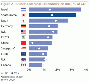 Bagaimana dengan hasil industri? Meski tergolong pemain baru, namun dalam sepuluh tahun terakhir produk-produk Korea telah menggerogoti pangsa pasar Jepang. Kemauan perusahaan Korea untuk menggelontorkan dana riset, juga menjadi faktor penting yang menyebabkan produk-produk mereka diakui dunia. Berdasarkan data yang dirilis OECD, di tahun 2015 persentase pengeluaran riset terhadap PDB Korea Selatan sudah di atas Jepang (Lihat Grafik 2). Bahkan di tahun itu menurut Bloomberg, Korea Selatan merupakan negara dengan inovasi ekonomi terbaik di dunia. Dengan melihat fakta-fakta tersebut, timbul pertanyaan di benak kita : benarkah sekarang produk-produk Korea telah melampaui produk Jepang. Mengingat selama ini, kita mengenal produk-produk Jepang — terutama elektronik dan otomotifnya — sebagai produk terbaik di dunia. Dalam sajian kali ini, kita akan melihat kinerja beberapa industri di kedua negara, dan membandingkannya untuk melihat siapa yang lebih unggul.