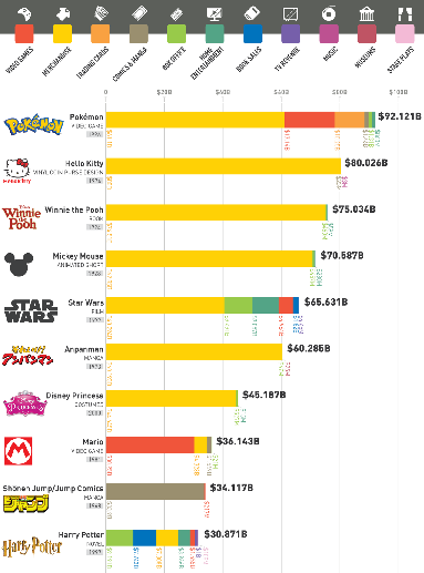 Untuk industri musik dan drama, boleh saja Korea telah melampaui Jepang. Namun tidak untuk industri animasi. Berdasarkan data yang dirilis gamedesigning.org, dari 50 studio animasi terbaik dunia, tak satupun perusahaan Korea yang muncul. Sedangkan Jepang menempatkan sebelas perusahaannya, yaitu Studio Ghibli, Toei Animation, OLM, Sunrise, Sony Pictures Imageworks, Sony Pictures Animation, Nippon Animation, Studio Pierrot, Production I.G., Studio 4ᴼC, dan Madhouse. Perusahaan-perusahaan itu membuat serial televisi, video game, dan commercial break yang di ekspor ke mancanegara. Namun jangan sangka industri animasi cuma beroleh pendapatan dari tiga sumber itu saja. Beberapa produk justru menghasilkan pundi-pundinya dari penjualan marchandise, komik, buku, musik, film, serta tiket museum. Contoh yang menarik adalah Pokemon. Animasi ini telah mengakumulasi pendapatannya senilai USD 92,12 miliar sejak diluncurkan 14 tahun lalu. Itu artinya, setiap tahun Jepang mendapat pemasukan sebesar USD 4 miliar, cuma dari Pokemon! Dari sepuluh animasi/karakter global dengan pendapatan terbesar sepanjang sejarah, Jepang punya lima produk. Setelah Pokemon di urutan pertama, ada Hello Kitty di urutan kedua (USD 80,03 miliar sejak 1974). Selanjutnya Anpanman (USD 60,29 miliar sejak 1973), Super Mario (USD 36,14 miliar sejak 1981), dan Jump Comics (USD 34,12 miliar sejak 1968) (Lihat Grafik 6). Satu-satunya negara yang bisa menyaingi produk animasi Jepang hanyalah Amerika.
