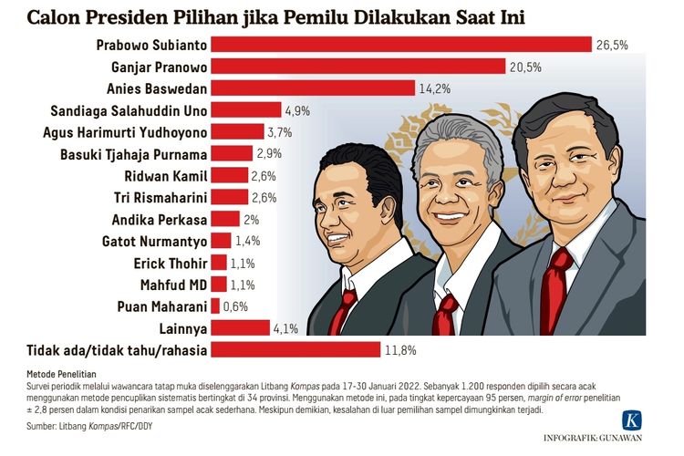 Pemilihan presiden RI yang baru, rencananya akan digelar pada tanggal 14 Februari 2024. Ini artinya tak sampai 21 bulan lagi, helat besar lima tahunan tersebut akan terselenggara. Namun beberapa partai politik, tukang survei, serta pengamat, sudah melakukan persiapan dengan menyorong nama-nama yang akan dipilih oleh rakyat nanti. Beberapa pollster bahkan sudah melakukan jajak pendapat dalam satu tahun terakhir. Dari hasil jajak pendapat itu, empat nama yang sering masuk ke dalam bursa capres adalah Ganjar Pranowo, Prabowo Subianto, Anies Baswedan, dan Ridwan Kamil. Urutannya tentu tak selalu seperti ini. Bisa berubah-ubah, tergantung pollster dan periode pengambilan sampelnya. Kadang Prabowo yang di atas, Ganjar di urutan kedua, Anies ketiga, dan di bulan yang lain bisa Ganjar di posisi pertama, diikuti oleh Anies, dan seterusnya.