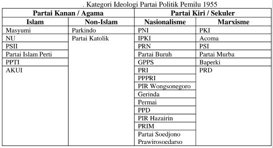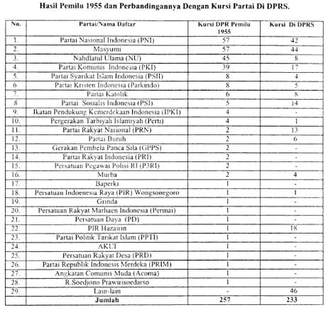 Dari hasil pemilihan anggota DPR dan Konstituante, ada empat partai besar yang keluar sebagai pemenang, yakni PNI, Masyumi, Nahdlatul Ulama (NU), dan Partai Komunis Indonesia (PKI). Sedangkan partai-partai lain yang beroleh kursi cukup lumayan adalah Partai Sarekat Islam Indonesia (PSII), Partai Kristen Indonesia (Parkindo), Partai Katholik, PSI, Ikatan Pendukung Kemerdekaan Indonesia (IPKI), serta Pergerakan Tarbiyah Islamiyah (Perti). Kalau kita menyigi 10 besar partai peraih suara terbanyak, ada tiga ideologi besar yang bertarung saat itu, yakni Nasionalis, Agamis, serta Marxis. PNI dan IPKI merupakan partai-partai yang berada di kubu Nasionalis. Masyumi, NU, PSII, dan Perti berada di kamp Islamis, serta Parkindo dan Partai Katholik merupakan partai umat Nasrani. Sedangkan yang berideologi Marxis, ada PKI dan PSI. Disamping Musyawarah Rakyat Banyak (Murba) dan Angkatan Comunist Muda (Acoma) yang hanya beroleh masing-masing 2 kursi dan 1 kursi parlemen.