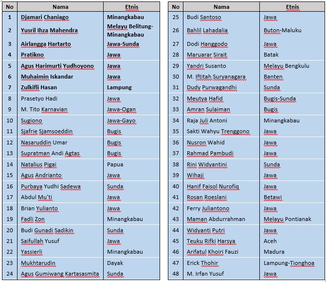 Dari data di atas, nampak bahwa pemerintahan Indonesia tak hanya diisi oleh orang-orang beretnis Jawa. Namun juga dikelola secara bersama-sama oleh politisi dan profesional dari berbagai etnis. Malah kalau kita hitung dalam Kabinet Merah Putih, sekitar 59,4% menteri justru berasal dari etnis non-Jawa. Berdasarkan fakta tersebut, maka sudah seharusnya kita menghentikan teriakan Jawa-sentris. Kalau pemerintahan kita masih dianggap mismanagement, mohon agar kritikan itu tak diarahkan pada suku tertentu. Karena boleh jadi ketidakbecusan ini juga dilakukan oleh menteri/pejabat dari etnis lain. Terlebih, seperti yang sudah diuraikan di atas, banyak ketidakberesan juga disebabkan oleh inkompetensi pemerintah daerah. Jadi, bersama artikel ini kami meminta kepada siapa-pun untuk menghentikan teriakan atau komentar yang menjurus SARA, yang bisa memperlemah persatuan bangsa. Apalagi sampai menghina dan mengeluarkan kata-kata tak pantas. Yuk, kita bangun Indonesia bersama, tanpa memandang suku dan latar belakang.