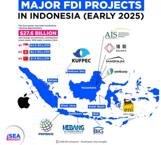 Dari sisi negara asal, Singapura masih mendominasi investasi asing langsung ke Indonesia. Hingga kuartal ketiga tahun 2025, total FDI dari Singapura mencapai USD 12,6 miliar, diikuti oleh Hongkong (USD 7,3 miliar), China (USD 5,4 miliar), Malaysia (USD 2,7 miliar), dan Jepang (USD 2,3 miliar). Banyak pihak menduga, tingginya nilai investasi Singapura dan Hongkong, disebabkan kembalinya modal orang Indonesia yang diparkir di kedua negara tax haven tersebut. Sementara itu investasi China, masih didominasi oleh pengusaha tambang yang membangun pabrik smelter untuk pengolahan barang tambang. Sebagaimana diketahui, saat ini China merupakan negara produsen manufaktur terbesar di dunia, yang membutuhkan bahan-bahan mineral dari Indonesia. Jika kita menilik asal FDI yang masuk ke Indonesia, peran Jepang sudah merosot tajam. Padahal di awal milenium ini, Jepang masih menjadi investor terbesar di Indonesia. Untuk tujuan FDI 2025, Jawa Barat masih berada di posisi teratas, disusul Sulawesi Tengah, DKI Jakarta, Maluku Utara, dan Banten